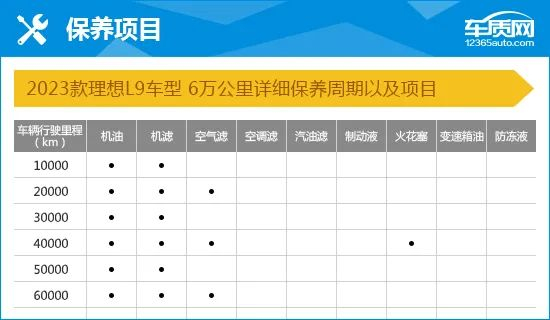 2023款理想L9车型的整车质保期为五年或10万公里。保养方面,全系车型需要在10000公里或12个月(以先到为准)时进行首保,保养项目为更换机油、机滤,此后每10000公里需要更换一次。空气滤芯和空调滤芯每20000公里更换一次;火花塞每40000公里更换一次;前减速器油和制动液每80000公里更换一次;防冻液每120000公里更换一次。在“百名车主评新车”调查中,对于2023款理想L9使用成本的评价,表示“非常满意”和“满意”的车主占比分别为30.1%和45.6%,另有14.6%的车主表示“一般”,认为“不满意”的车主占比为9.7%。