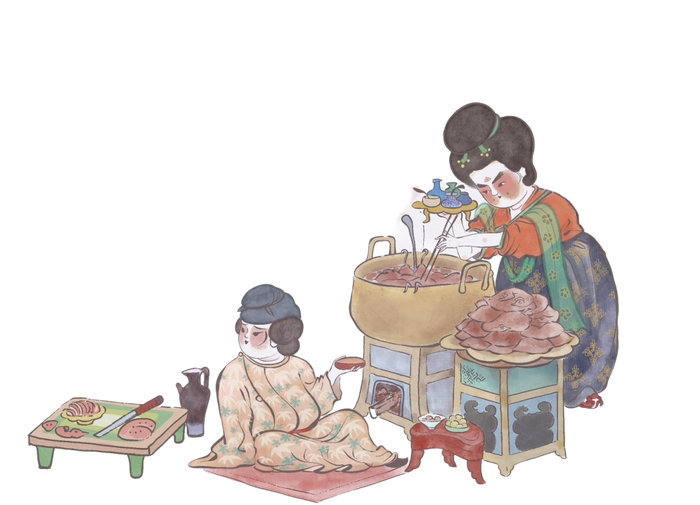 《唐人媚灶宴乐图》中烹肉切食场景。墨湫龍绘。