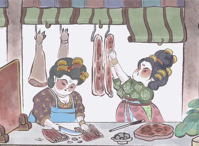 《唐人媚灶宴乐图》中卖肉切肉场景。墨湫龍绘。
