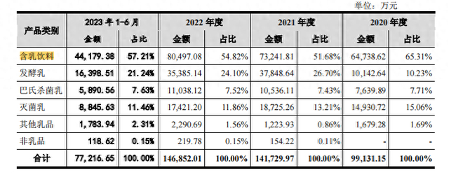 招股书显示,菊乐股份的主营业务为含乳饮料及乳制品的研发、生产和销售,其主要产品包括含乳饮料、发酵乳、巴氏杀菌乳及灭菌乳等。报告期内,含乳饮料的营收占比在50%以上,是公司的重要收入来源。