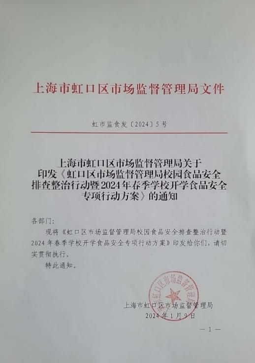 春节前夕,虹口区市场监管局就制定了《虹口区市场监督管理局校园食品安全排查整治行动暨2024年春季学校开学食品安全专项行动方案》,明确工作措施,从落实主体责任、强化食品安全培训、督促自查自纠、全覆盖检查、部门联合督查等五个方面推进校园“日管控、周排查、月调度”风险管控机制落实。寒假前,开学前,分别通过微信监管工作群、实地检查等方式对各类学校发放《虹口区市场监管局寒假期间校园食品安全告知书》《虹口区学校食堂春季开学前食品安全提示》等食品安全风险提示,要求各学校负责人开学前自行组织学习食品安全等知识,并围绕设施设备维护、场所环境卫生、餐饮具工用具清洁消毒、食品贮存、从业人员健康管理等重点内容开展全面自查,督促做好开学前各项准备工作,严控食品安全风险。