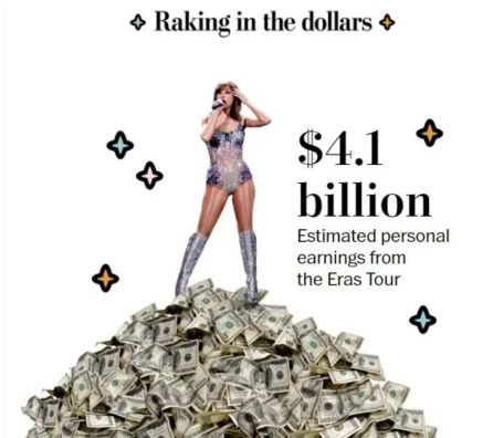 据经济学家估计,Eras总共将会给霉霉带来41亿美元收入,届时这场巡演将成为有史以来最赚钱的巡演,没有之一。