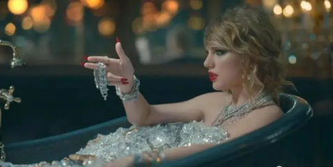 新专辑中,充满了大量毒蛇的元素,这也是一年前人们辱骂她的词汇。她把自己打扮成蛇蝎美人,涂着大红唇、烟熏妆躺在铺满钻石的浴缸中,而这一场景正是对卡戴珊的嘲笑。