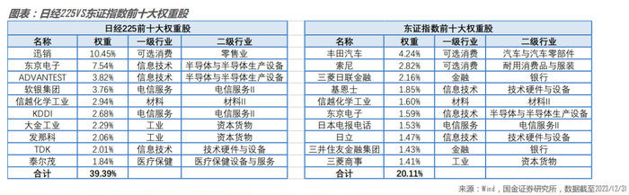 在行业分布上,两者相似,占比最高的前三大行业为可选消费、工业和信息技术,也是日本经济的支柱产业。东证指数的行业分布更为均衡,信息技术占比稍高一点。