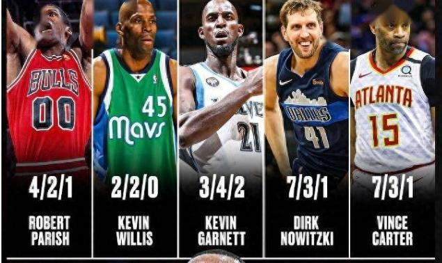 5名球员NBA第21赛季的场均数据【罗伯特-帕里什(场均4分2篮板1助攻)、凯文-威利斯(2分2篮板0助攻)、凯文-加内特(3分4篮板2助攻)、德克-诺维茨基(7分3篮板1助攻)、文斯-卡特(7分3篮板1助攻)】