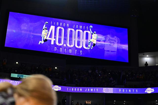 比赛未开始前,湖人主场大屏幕上已经出现了詹姆斯生涯40000分里程碑的倒计时专栏