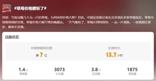 元宵过后,“草莓价格大跳水”“草莓价格腰斩”等相关的话题多次冲上微博热搜。