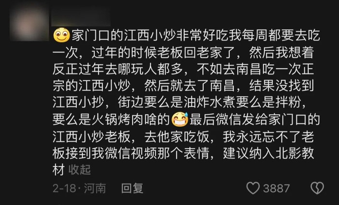据江浙沪打工人朋友透露,每天一顿江西小炒,两眼放光,眼泪直流,“感觉被生活工作摧残麻木的‘尸体’,都被唤醒了。”