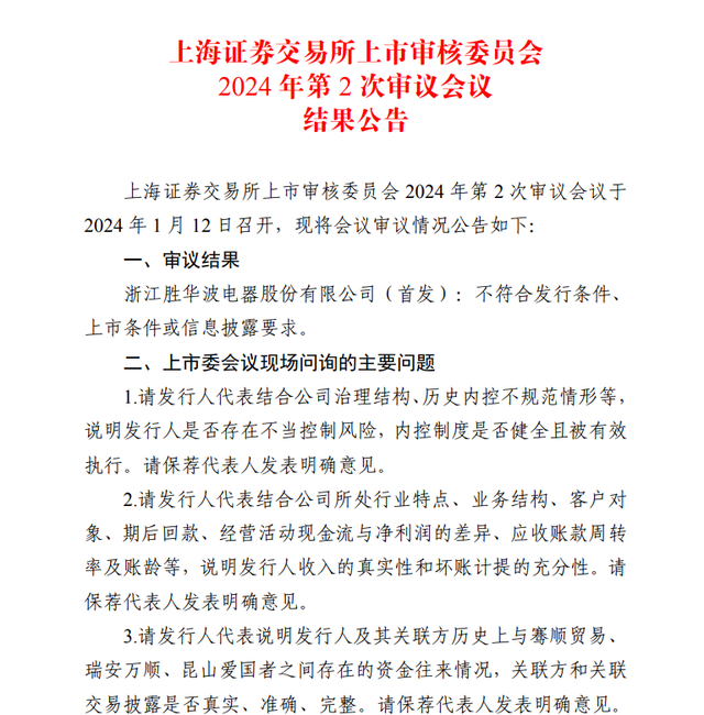 具体来看,1月12日,上交所上市委对浙江胜华波电器股份有限公司(以下简称“胜华波”)IPO申请作出审议,认为其不符合发行条件、上市条件或信息披露要求,胜华波成为2024年度首个被否的IPO项目。上市委审议认为,胜华波未能说明内部控制制度健全且被有效执行,未能充分说明财务报表在所有重大方面公允反映发行人的财务状况、经营成果和现金流量,不符合《首次公开发行股票注册管理办法》第十一条的相关规定。