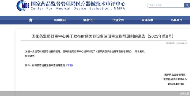 2023年4月,国家药监局医疗器械技术审评中心发布《射频美容设备注册审查指导原则》明确,射频美容设备分类编码为09-07-02、按第三类医疗器械管理,并阐明此类产品注册审查要点、主要风险点、适用标准等具体要求。其中,临床评价要求提到,射频美容设备不属于免于进行临床评价目录中的产品,应参照《医疗器械分类目录》子目录09“物理治疗器械”相关产品临床评价推荐路径开展临床评价。