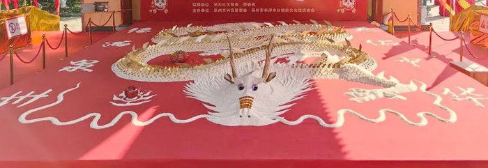 从高处向下看,“米龙”的两边用大米书写了“天佑中华,福满泉州”。龙是中国传统文化中延续时间最长、最具代表性的形象符号,而大米在民间被称为平安米。用大米堆出一个巨大的“龙图腾”,寓意着平安喜乐、增福增寿、财源滚滚。