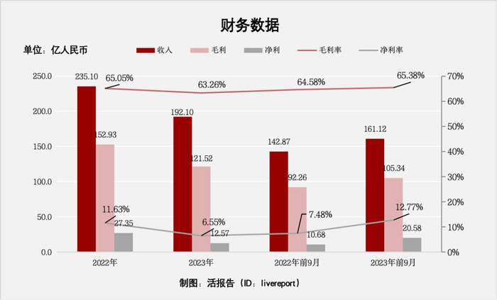 收入分别约为人民币235.1亿元、192.1亿元、142.9亿元及161.1亿元,2023年同比增长率为-18.29%,2023年前9月同比增长率为12.78%;