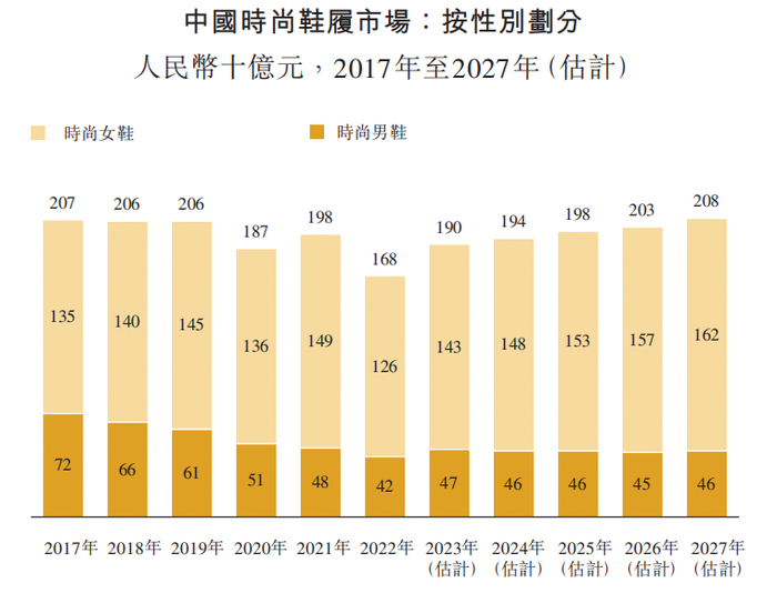 中国时尚鞋履市场包括时尚男鞋及时尚女鞋(不包括运动鞋及14岁以下儿童的鞋履)。根据弗若斯特沙利文的资料,2022年中国时尚鞋履市场的零售总额居全球第二。尽管受公共卫生事件影响,中国时尚鞋履市场零售总额由2017年的人民币2,069亿元下跌至2022年的人民币1,685亿元,但预计疫情之后有所反弹,2022年至2027年将以4.3%的复合年增长率增长,将于2027年达人民币2,076亿元。于2022年,时尚女鞋于中国时尚鞋履市场零售总额中的占比为74.9%,预计此分部将保持增长势头,并于2027年占比达到78.1%。