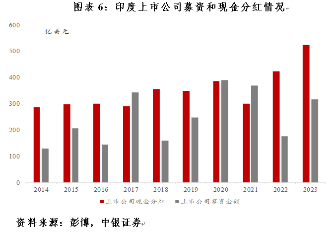 另一方面,印度也比较注重股票市场的投融资平衡。近年来,上市公司分红(现金分红)金额整体高于募资(上市+增发+优先股发售)金额。2023年全年,印度上市公司募资金额约为316亿美元,而同期上市公司现金分红规模约为525亿美元,是募资金额的1.66倍。2014~2023年间,除2017年、2020年和2021年上市公司募资金额小幅高于分红金额之外,其余年份分红金额均显著更高(见图表6)。这十年中,印度上市公司合计募资约2482亿美元,现金分红约3514亿美元,后者是前者的约1.42倍。从募资的相对规模来看,印度上市公司募资规模占全市场市值比例近年来也大致一直维持在1%~2%,显示募资对市场的“抽血”效应并不显著。