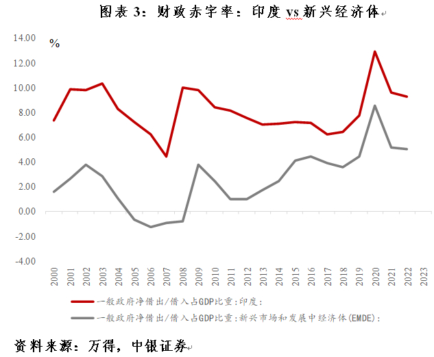 印度长期实施强度较高的扩张性财政政策,且近年来强度进一步走高。据IMF统计,印度财政赤字率(一般政府净借出/借入占GDP比重)在2000~2022年间平均为8.2%,而同期全球新兴市场和发展中经济体的财政赤字率为4.0%,印度的财政赤字率是新兴经济体的两倍以上。2000年至今,除2006~2007年(两年平均赤字率为5.2%)和2017~2018年(两年平均赤字率为6.3%)的赤字率偏低之外,其余年份的赤字率均维持在7.0%或以上的较高水平。2022年,印度财政赤字率为9.2%,虽然较疫情冲击后的2020年和2021年有所回落,但仍显著高于疫情前2010~2019年平均6.8%的水平(见图表3)。
