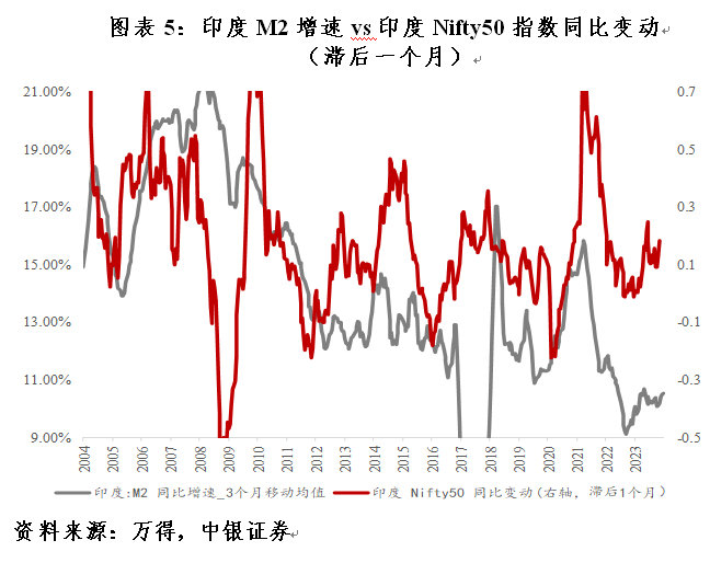 此外,广义流动性的变动也对印度股市存在一定的影响。历史数据显示,印度Nifty50指数的同比变动大约滞后印度M2同比增速变动约一个月(见图表5)。广义流动性变化一方面对于实体经济活动和企业利润变动具有一定的领先作用,另一方面也影响资本市场的增量资金供给。印度央行通过调整利率走廊,进行公开市场操作和调整金融监管政策等方式调节广义流动性,整体充裕的广义流动性也支持了印度股市整体的优异表现。