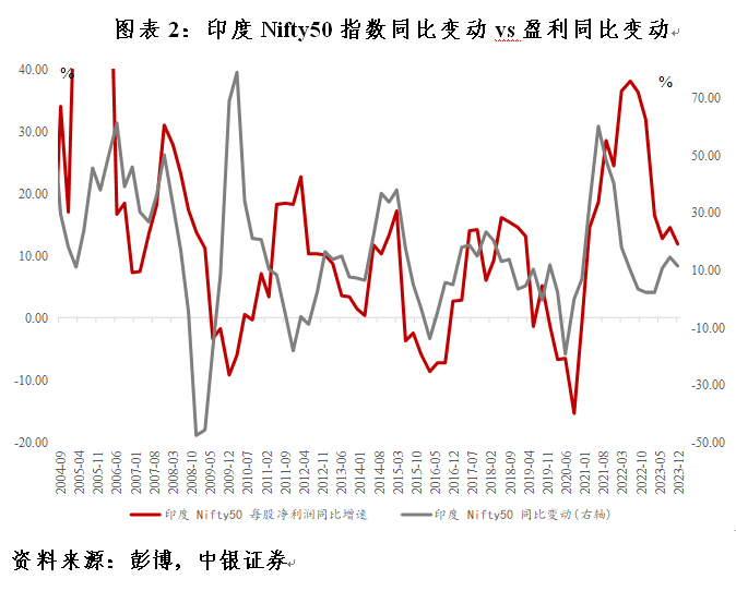 印度上市公司盈利水平随着印度经济增速起伏变化,前者直接影响印度股票市场走势。从历史整体的利润变动情况看,2004~2023年,印度Nifty50指数每股净利润同比增速的均值为14.6%,快于同期明晟(MSCI)新兴市场指数每股净利润平均12.5%的增速。从利润变动的节奏看,印度Nifty50指数每股净利润同比增速走势大致呈现出三到五年一个周期(增速由低逐步走高,之后再触顶回落)的特征,而股指变动也大致追随利润周期的变动(见图表2)。