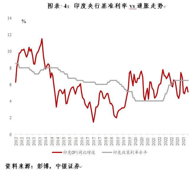印度央行货币政策的主要目标是维持物价稳定,同时兼顾经济增长目标。2016年以来,印度央行正式将4%的CPI同比增速作为通胀目标,并追求将通胀控制在2%~6%。2014~2017年间,印度通胀水平增速从高位震荡回落,并一度跌破2%的政策目标区间下限。为此,印度央行采取宽松的货币政策,持续调降政策利率,逐步将基准利率由8%下调至6%,推动了经济增长和通胀水平回升。2020年疫情暴发后,印度央行又快速将政策利率由5.15%大幅下调至4%,这使得印度经济在疫后强劲反弹,但也导致通胀于2022年1月~2023年2月间持续高于6%的政策目标区间上限。因此,印度央行从2022年二季度开始紧缩货币,一年左右时间将基准利率由4%升至6.5%。在强力紧缩的影响下,印度经济增速由高位回落,通胀增速也再次回落至6%以下,2024年1月为5.1%(见图表4)。整体来看,印度央行灵活调整货币政策,避免了通胀的大起大落,为印度股市长牛创造了稳定的宏观经济环境。