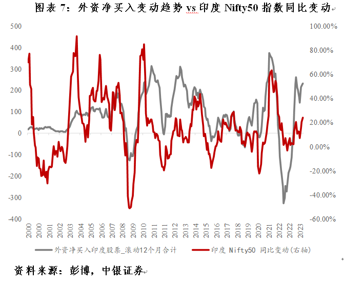 在经济增长强劲、股市表现优异以及金融市场改革持续推进等因素的共同吸引下,外资长期持续净买入印度股票。2000~2023年间,除2008年、2011年、2018年和2022年净卖出外,其余年份均是外资净买入,其中2023年净买入约214亿美元,在外资年度净买入额中排名第四。截至2024年1月末,外资(FPI)持仓约占印度股票市值的16%。实际上,自2007年以来,外资净买卖印度股票的趋势性变动同步甚至略微领先于印度股指的同比变动,这显示外资对于印度股市的影响不容忽视(见图表7)。