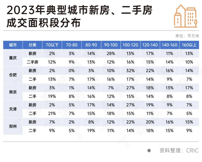 ▲从二线城市的成交结构也可以看出,90㎡以下面积段,二手房成交占比普遍高于新房;而到了90㎡以上,这个交易结构便逆转了,新房成交占比明显高于二手房。
