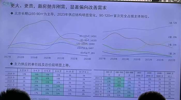 ▲面对二手房的价格战,北京新房不得不抛弃刚需、更偏改善,成交结构中,1000-1500万的房产最稳,小户型反而没有大户型热销。