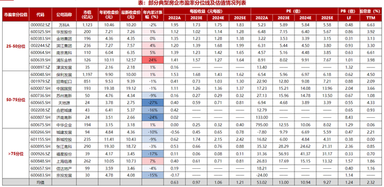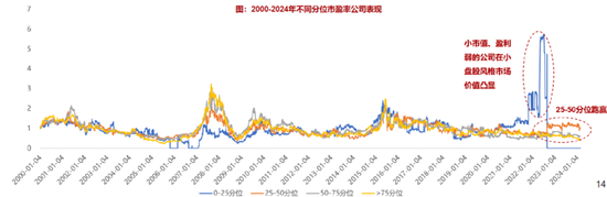 剔除盈利为负值的公司,我们将PE市盈率分为四个档位。2022-2023年,房地产仍处于下行周期时,市盈率在25-50分位的上市公司股价表现跑赢显著。0-25分位的上市公司主要为小市值、盈利弱的公司,这类公司在21-22年小盘股风格主导的市场中交易价值凸显,但进入23年之后陆续进入盈利负值(盈利为负值即剔除出去),因此在图表中这类公司23年之后数值为0。