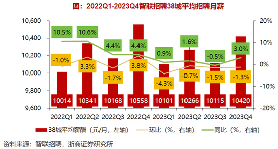 ①工资收入:2023Q4智联招聘38城企业平均招聘薪酬10420元/月,环比上升3%,同比小幅下降1.3%;在智联招聘分类的44个行业中,2023Q4期间21个行业薪酬上涨,23个行业薪酬下跌,其中贸易、新能源、医药等行业薪酬同比上涨,银行、互联网、IT等行业薪酬同比下降;由此来看,社会整体招聘薪酬较为稳定,部分居民的“降薪”感知差异主要原因是结构性薪酬调整;