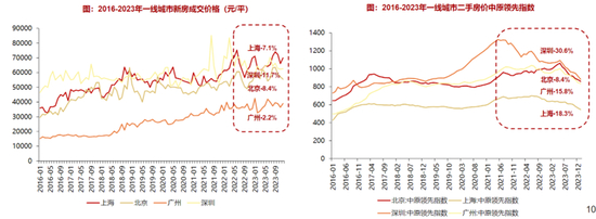 新房房价分别变动比例为-8.4%、-7.1%、-2.2%、-11.7%;根据中原领先指数,2023年12月二手房房价领先指数较2021年6月相比,北京、上海、广州、深圳分别变动比例为-8.4%、-18.3%、-15.8%、-30.6%。