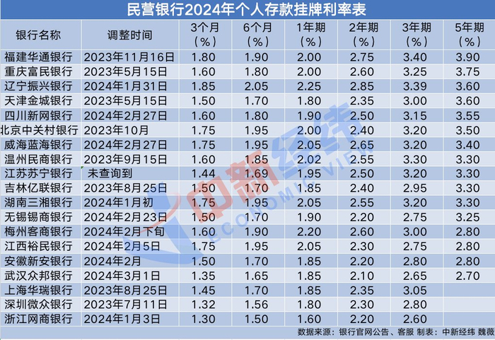 19家民营银行中,12家五年期整存整取产品的挂牌利率超3%。比如华通银行、富民银行五年期整存整取存款挂牌年利率分别为3.90%、3.75%,与四大行的2%相比,分别高出190个基点和175个基点。这两家银行分别于2023年11月16日和2023年5月15日更新了存款利率表。目前,存款利率尚未调整。