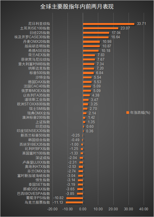 从全球范围内主要股指的表现看,日经225指数在今年头两个月,以约17%的涨幅领涨发达市场。