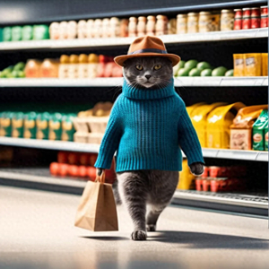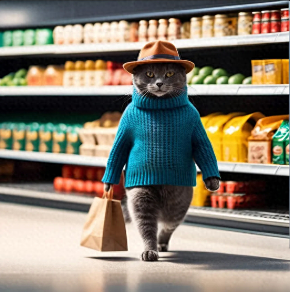 记者用关键词“猫 穿着毛 衣 戴帽子 逛超市 饮料货生成的AI猫猫