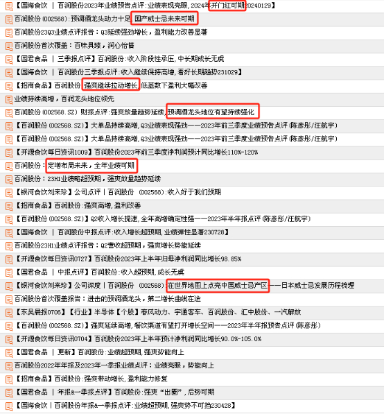 券商研报大部分给出的观点是“烈酒未来可期”“国产威士忌”“龙头地位”: