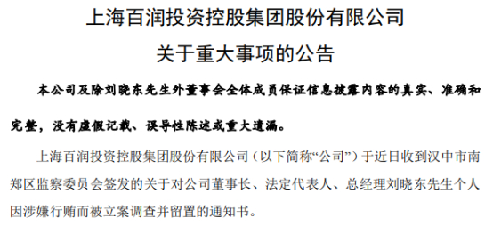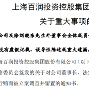 近日,百润股份发布公告,公司收到山西省汉中市南郑区监察委员会签发的对公司董事长、法定代表人、总经理刘晓东个人因涉嫌行贿而被立案调查并留置的通知书。