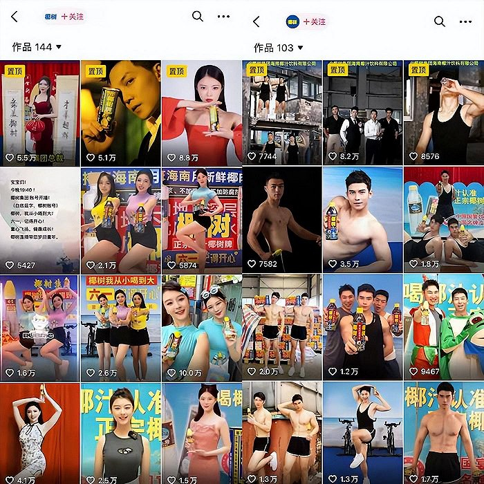 其实自2021年前,椰树集团便将自己的营销重点转移到了线上,多以男女模特短视频广告为主,还未尝试直播的转播效果。