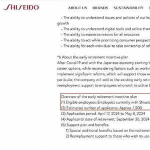 2月29日,资生堂集团在官网发布了一条针对其日本业务的“提前退休”计划,指出今年将有1500名员工离职,占其全球员工总数的近4%,并同时对参与人员设定了严格的年龄和任期标准要求。