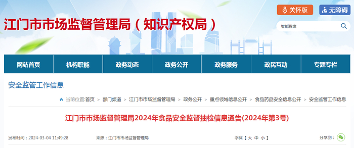 广东省江门市市场监督管理局2024年食品安全监督抽检信息通告(2024年第3号)