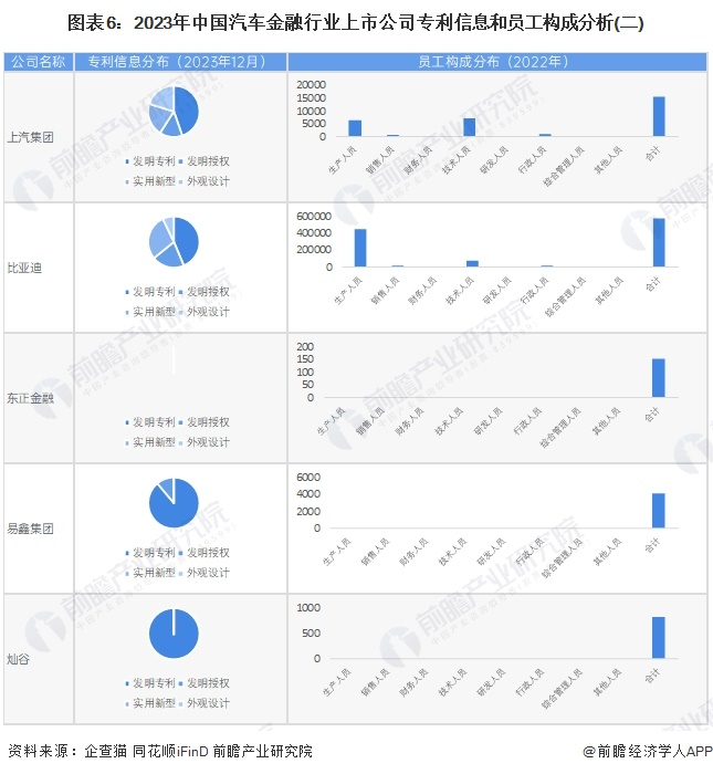 从汽车金融行业的上市企业已有的公开信息分析,专利信息相对较多的企业是比亚迪和江淮汽车,专利数量均超过2万,其中江淮汽车发明专利数量最多,为10020条;上市公司中员工总数最多的企业是比亚迪,员工总数为570060人。