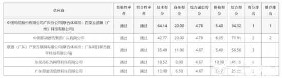 在结果公告中显示,参与竞标的资格审查和符合性审查都已通过,在综合诚信得分、和价格得分中,广东电信联合体并不是最高的,不过,在技术得分中,广东电信联合体成为推荐排名中的第一位。
