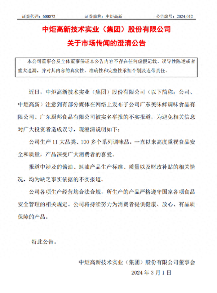 针对这样的微博举报,中炬高新这几天都在发澄清公告,并表示举报内容不实,公司生产的产品完全符合国家食品安全管理的相关规定。