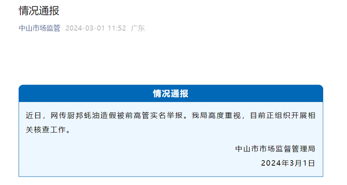 在举报信发出后,3月1日,广东中山市市场监督管理局就近日“网传厨邦蚝油造假被前高管实名举报”一事发布《情况通报》称,高度重视,目前正组织开展相关核查工作。