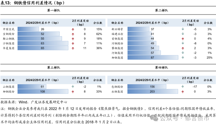 钢铁发债企业信用利差走势也存在分化。其中,华菱集团、鞍山钢铁、柳钢股份、宝钢股份和沙钢集团信用利差走扩7-11bp,而包钢股份、河钢股份利差分别收窄17bp、8bp,新兴铸管、福建冶控、柳钢集团、河钢集团和山钢集团利差收窄2-5bp。目前,钢铁企业信用利差大多处于2018年以来0%-25%左右分位数,相对价值一般。