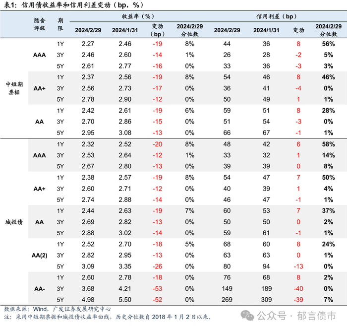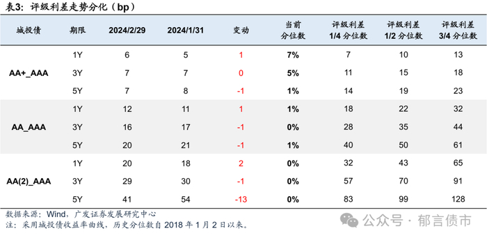 2024年2月债牛延续,债市定价由“看预期”转为“看交易”,长端利率屡屡向下突破。信用债收益率全线下行,短久期品种信用利差被动走扩。城投债AAA和AA+ 1Y信用利差处于2018年以来50%-58%分位数,各评级3Y和5Y信用利差处于0%-14%分位数。