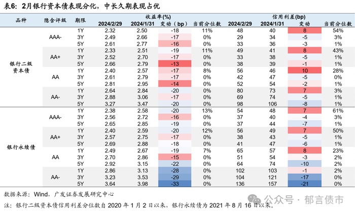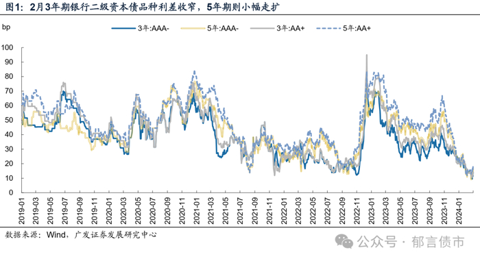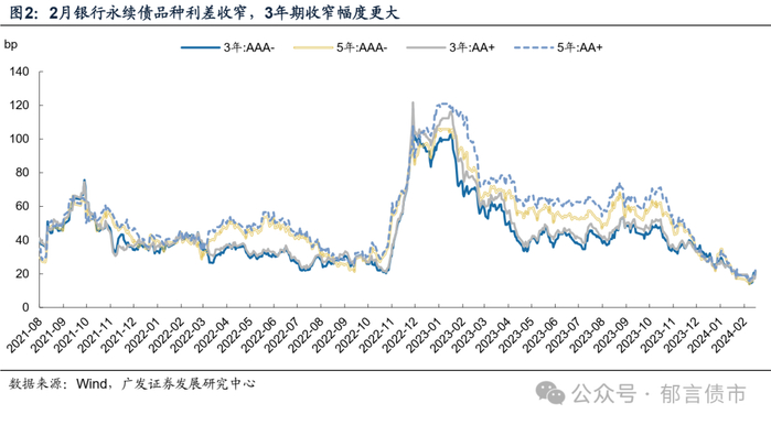 2024年2月,银行资本债和普通金融债之间的品种利差表现分化,3年期银行二级资本债品种利差收窄,5年期则小幅走扩;银行永续债品种利差均收窄,其中3年期收窄幅度更大。截至2月29日,3Y AAA-和AA+银行二级资本债品种利差相较1月31日分别收窄4bp、5bp,5Y AAA-和AA+则分别走扩1bp、3bp。3Y AAA-和AA+ 银行永续债品种利差分别收窄3bp、5bp,5Y AAA-和AA+均收窄2bp。