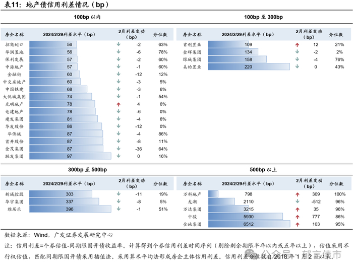2024年2月,国企地产债信用利差继续修复,但部分公众企业和民企表现欠佳。其中,国企的金茂集团信用利差大幅收窄36bp,金融街和华发股份利差均收窄12bp,首开股份、华润置地和电建地产利差收窄6-8bp。而公众企业的万科地产、金地集团利差分别走扩309bp、103bp,民企的万达集团利差走扩35bp。