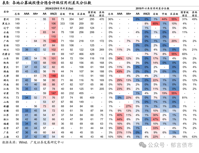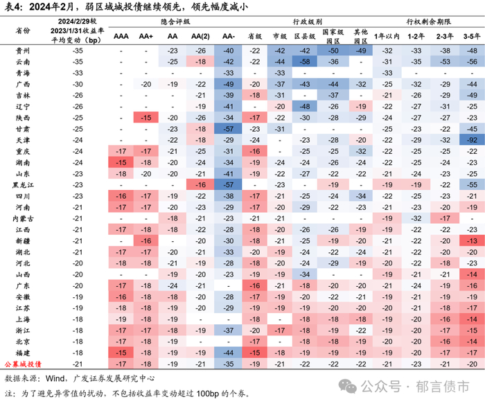 我们以2024年2月29日存量公募城投债为样本,计算每只城投债2024年2月29日较1月31日行权收益率的变动值,并得到各省城投债分隐含评级、行政级别、期限的收益率平均变动值。