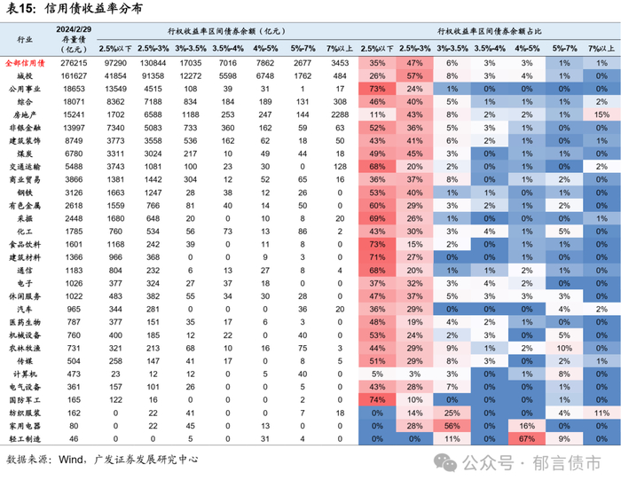 产业债分行业看,有2/3行业净融资为正,其中食品饮料、建筑装饰和综合净融资在580-680亿元左右,通信、公用事业、商业贸易、煤炭和非银金融净融资在260-350亿元左右,而采掘行业净融资缺口相对较大,为-416亿元。