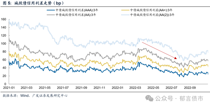 发达区域区县城投供不应求,带动城投债隐含评级AA(2)信用利差收窄超过30bp(2022年初至11月调整前),较2021年初大幅收窄近100bp;同时2022年中高评级城投债信用利差中枢较2021年也下行10-20bp左右。