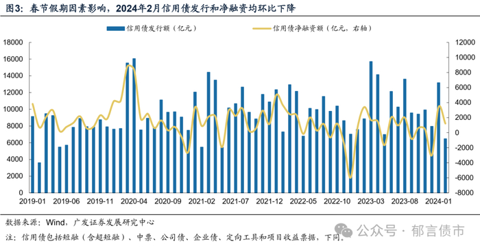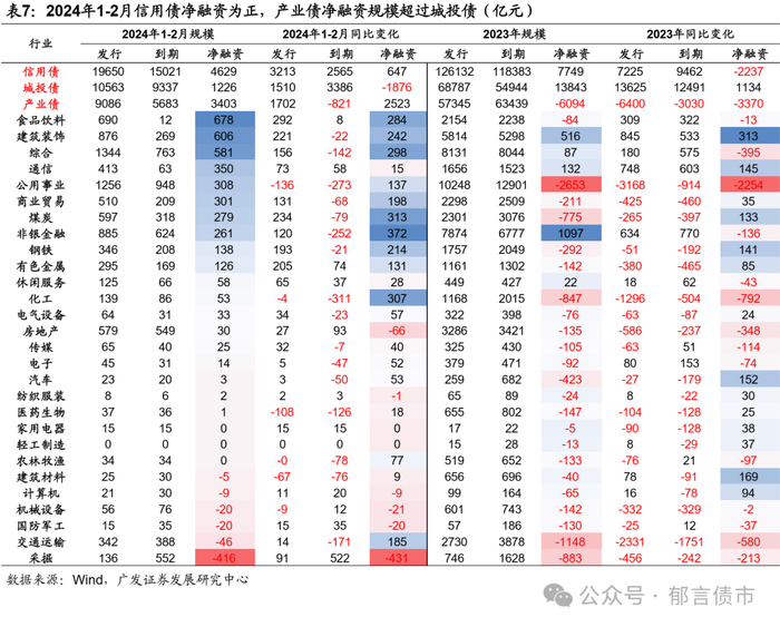 2024年1-2月,资产荒导致信用债极致的抢券行情,其中城投债净融资同比下降、发行情绪持续高涨,产业债净融资同比上升且发行情绪上涨。考虑到春节假期因素,我们累计统计1-2月信用债发行和净融资并进行同比。2024年1-2月,信用债共发行19650亿元,同比增加3213亿元,净融资额为4629亿元,同比增加647亿元。其中城投债净融资额为1226亿元,同比下降1876亿元;产业债净融资额为3403亿元,同比增加2523亿元。