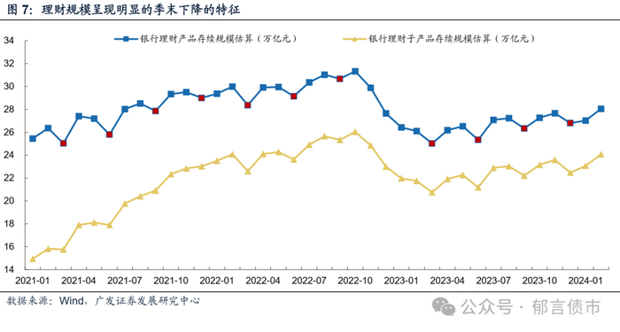 信用债需求方面,银行理财规模呈现季末下降的特征。受商业银行相关管理考核要求影响,银行在季末增加存款的动力较强,理财产品的期限和到期安排体现银行在季末对存款的需求。理财定开期或者存续期多设置为3个月和其整数倍,到期日和开放日一般也在临近季末的时点。