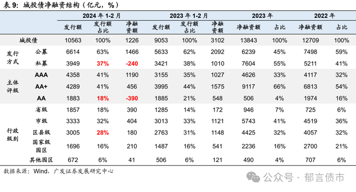 2024年1-2月,低评级、区县级城投债的发行额占比同比下降,而高评级、省级城投债占比上升,私募债和AA城投债净融资额为负。1-2月城投私募债发行额占比为37%,低于去年同期的38%,私募债净融资额为-240亿元。分行政级别看,区县级城投债发行额占比为28%,低于去年同期的31%;而省级城投债发行额占比为18%,高于去年同期的14%。分主体评级看,AA城投债发行额占比仅18%,低于去年同期的21%,净融资额为-390亿元;而AAA城投债发行额占比由35%上升至41%,净融资额为1190亿元。